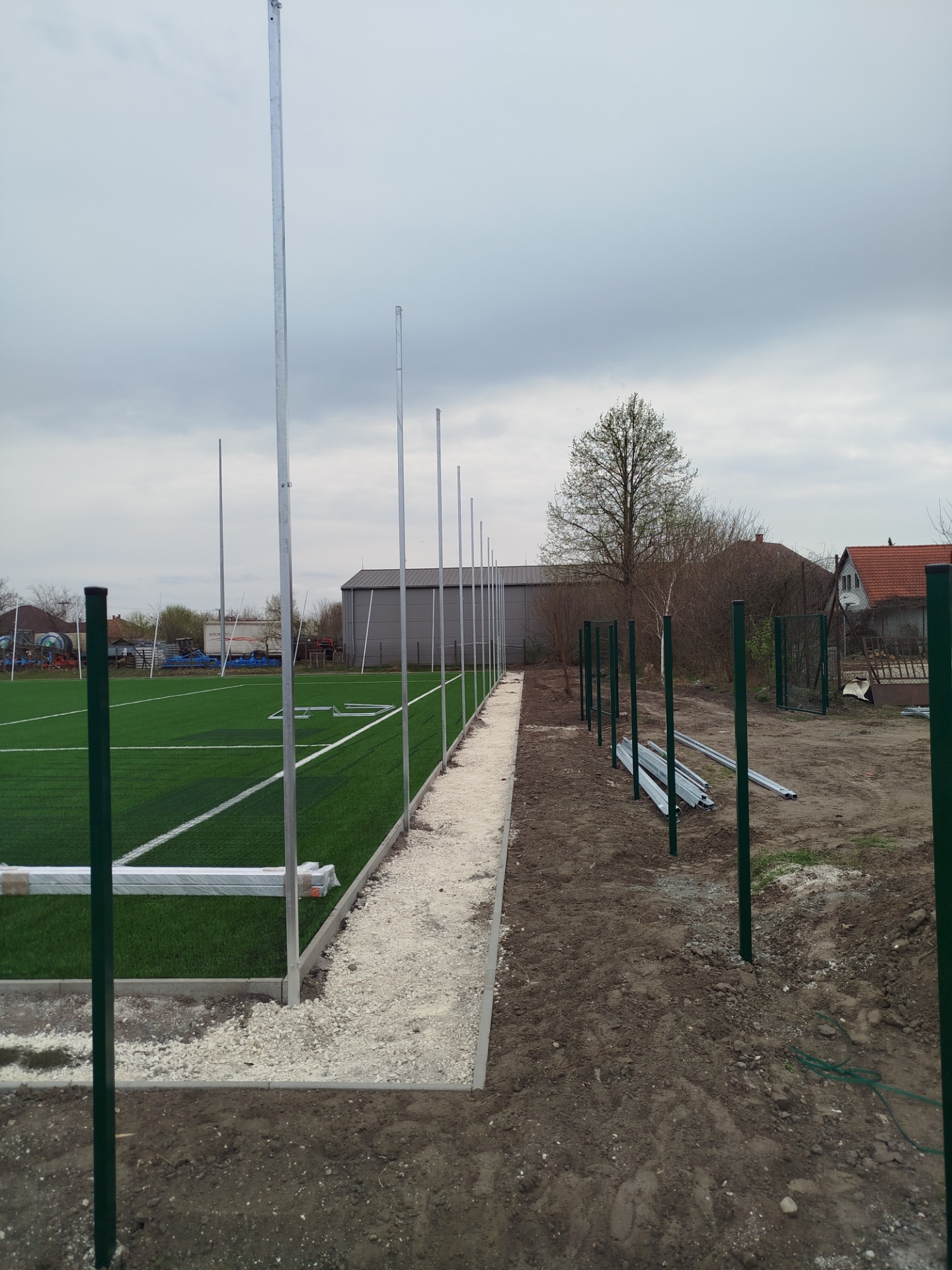 Az utolsó műveletek is elkezdődtek, ahol ma a labdafogóháló tartóoszlopai kerülnek felállításra. Megèrkeztek a kapuk, hálók, s hètfőn a kispadok is a helyükre kerülnek. A tèrkövezèssel ès a lámpatestek felszerelèsèvel, beállításával zárjuk a jövő hèten a projektet. Ezután már csak a tereprendezès, füvesítès marad a pálya körül.